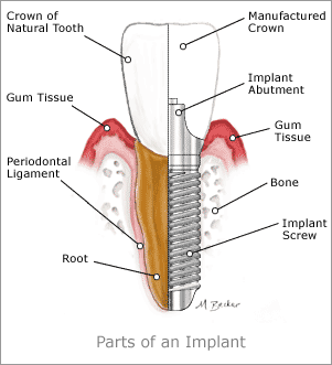 Dental Implants are the latest innovation to replace a missing tooth or a number of teeth. An implant consists of an artificial titanium rod which is placed directly into the jaw bone and acts as a replacement for the root portion of the natural tooth. The implant is made using pure titanium which allows new bone cells to grow around it: the implant then integrates with the newly formed bone which firmly locks it into place. This process is called ‘Osseointegration’.